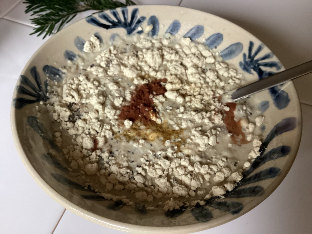 2 gehäufte EL Sojaproteinisolat, 1EL Chiasamen, 2EL Erythrit, 2EL Flohsamenschalen, 1TL Garam Masala (mit Kardamom), 1TL Kakaopulver, 400 ml Sojamilch, ein Schuss Sojasahne